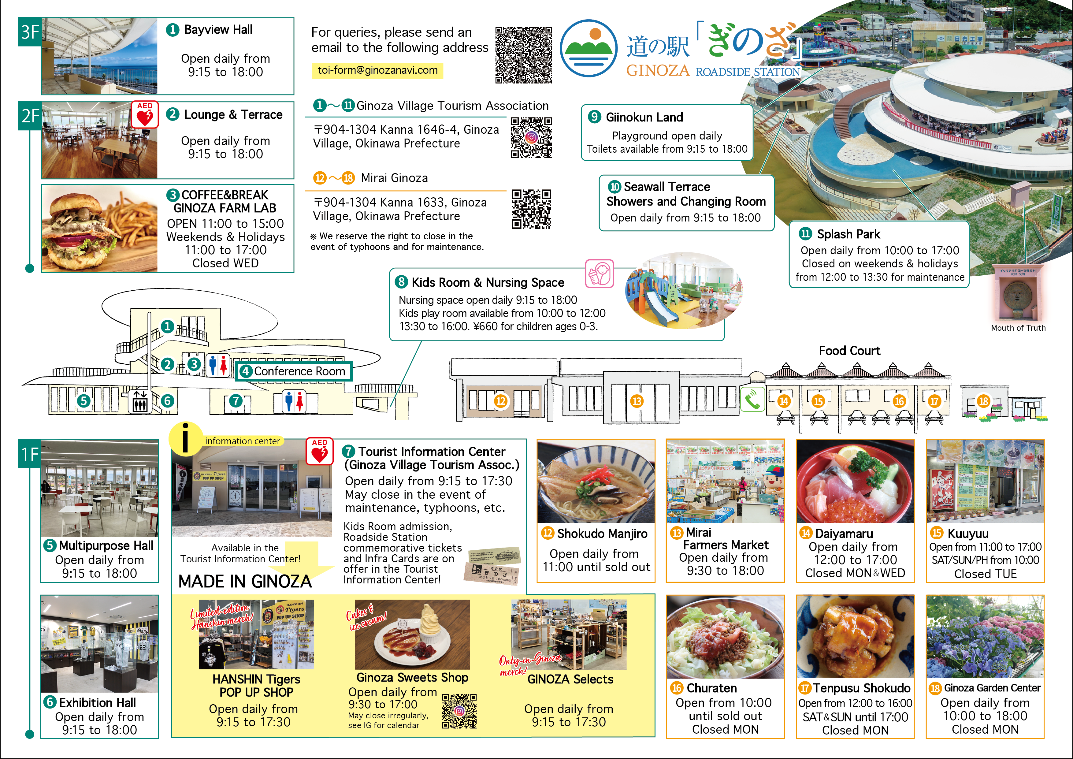 Children can enjoy our indoor playroom, or our outdoor splash park and playground. We offer numerous shopping opportunities, from a pop-up shop dedicated to the Hanshin Tigers, who hold their spring camp in Ginoza every year, to our showcase Mirai Farmers’ Market, where you can purchase locally-produced specialty products. If you’re feeling hungry, our roadside station has a selection of restaurants and cafes serving everything from burgers to fresh sashimi. Clean restrooms, open 24 hours a day, are available for your convenience, and we also provide a coin-operated shower room.